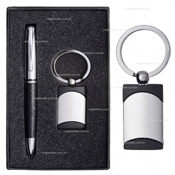 Brinde kit executivo com caneta e chaveiro personalizado.